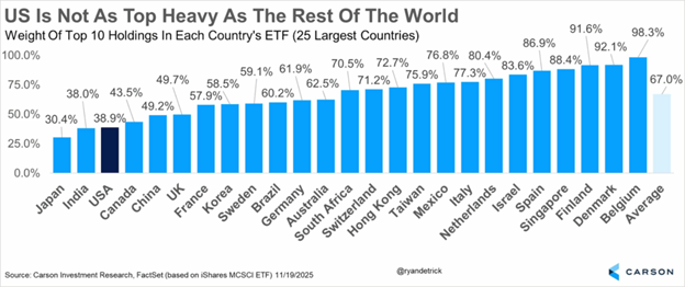 Yes, the top 10 stocks in the US account for nearly 40% of the overall market cap of the US. Here’s the thing, it was 39% last year at this time and things have done just fine. But looking around the globe shows the US is actually one of the least top heavy countries! In fact, only Japan and India are less top heavy. We don’t have the same worry about this as others, but when you show it this way it really hammers home the US isn’t as top heavy as they make it seem.