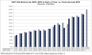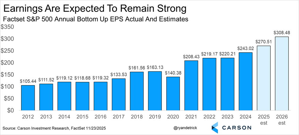 Years without a recession (and we don’t expect a recession in 2026) rarely have big losses, as only 5% of the time stocks fall double digits. Taking it the other way, double digit gains happen 68% of the time and stocks finish the year higher an incredible 85% of the time. Should this all play out again, next year could be another solid year for investors. Something to indeed be thankful for.