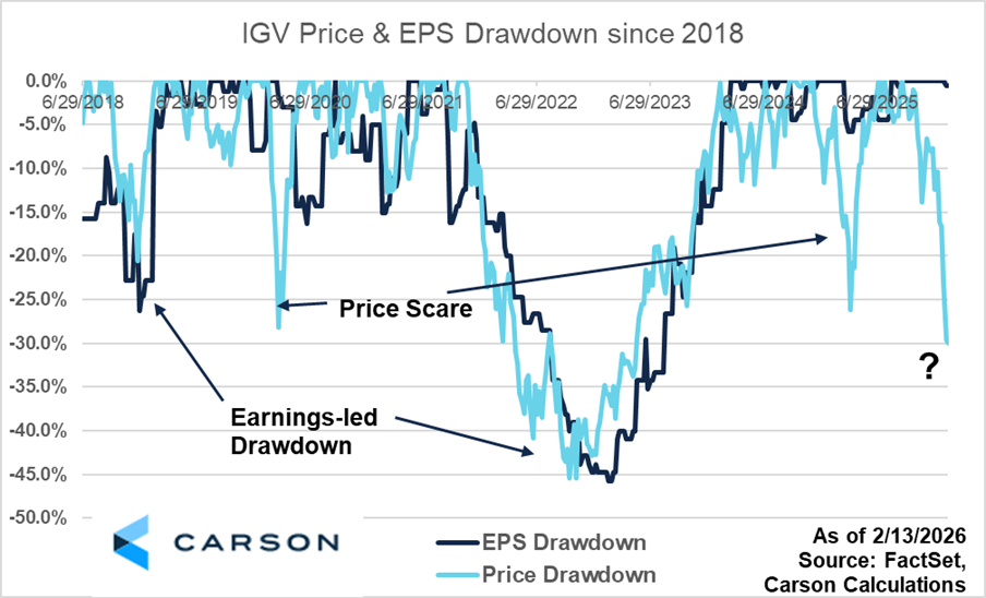 However, not all of these drawdowns are created equally. In two cases, the decline was largely a ‘price scare’ – where valuation compressed more than earnings. As shown below, software investors have seen this a few times, such as in early 2020, when IGV fell more than 25% from its highs while trailing-twelve-month EPS declined roughly 15%. A similar pattern emerged during the ‘Tariff Tantrum’ in early 2025, when prices dropped by more 25%, but trailing earnings declined a little more than 5%.