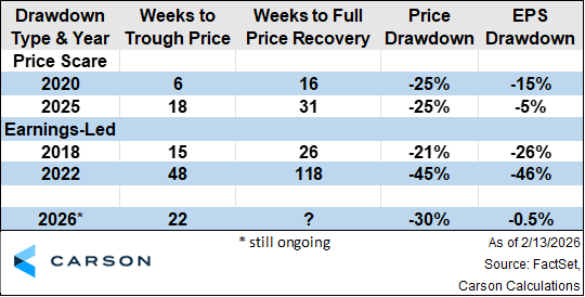 Software’s Selloff has continued as of late, with the industry now in a roughly 30% drawdown. We’re witnessing the fifth bear market for the industry in the prior eight years – and perhaps there are lessons to be learned from this recent history. Price scares recover quicker than earnings-led drawdowns. But 2026’s drawdown is both longer and harsher than recent price scares, suggesting that the industry’s earnings may be about to take a hit.