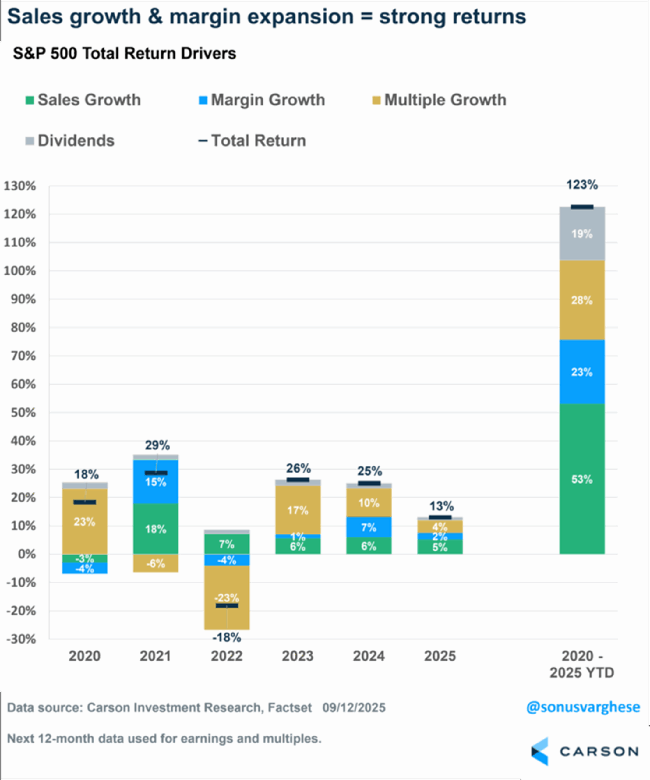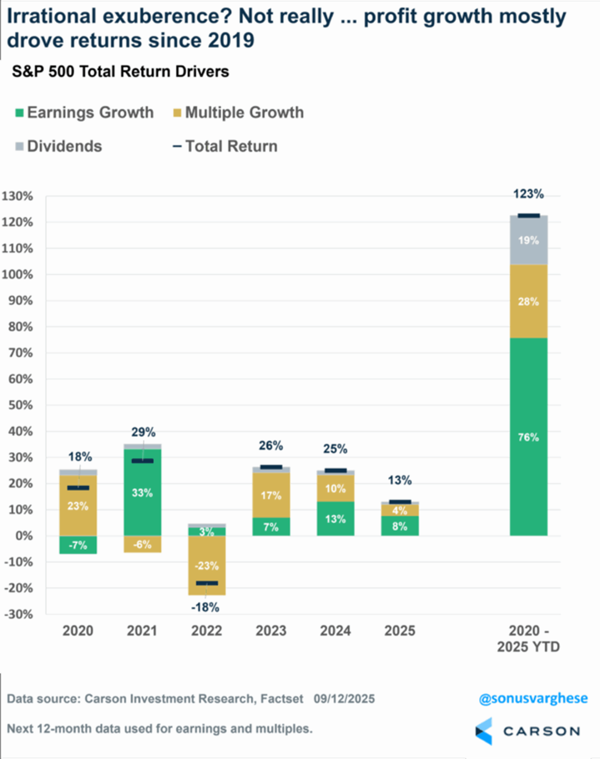 Zooming back over the past 5.5+ years (2020-2025 YTD), the S&P 500 has gained 123%. That return can be broken down into returns from: