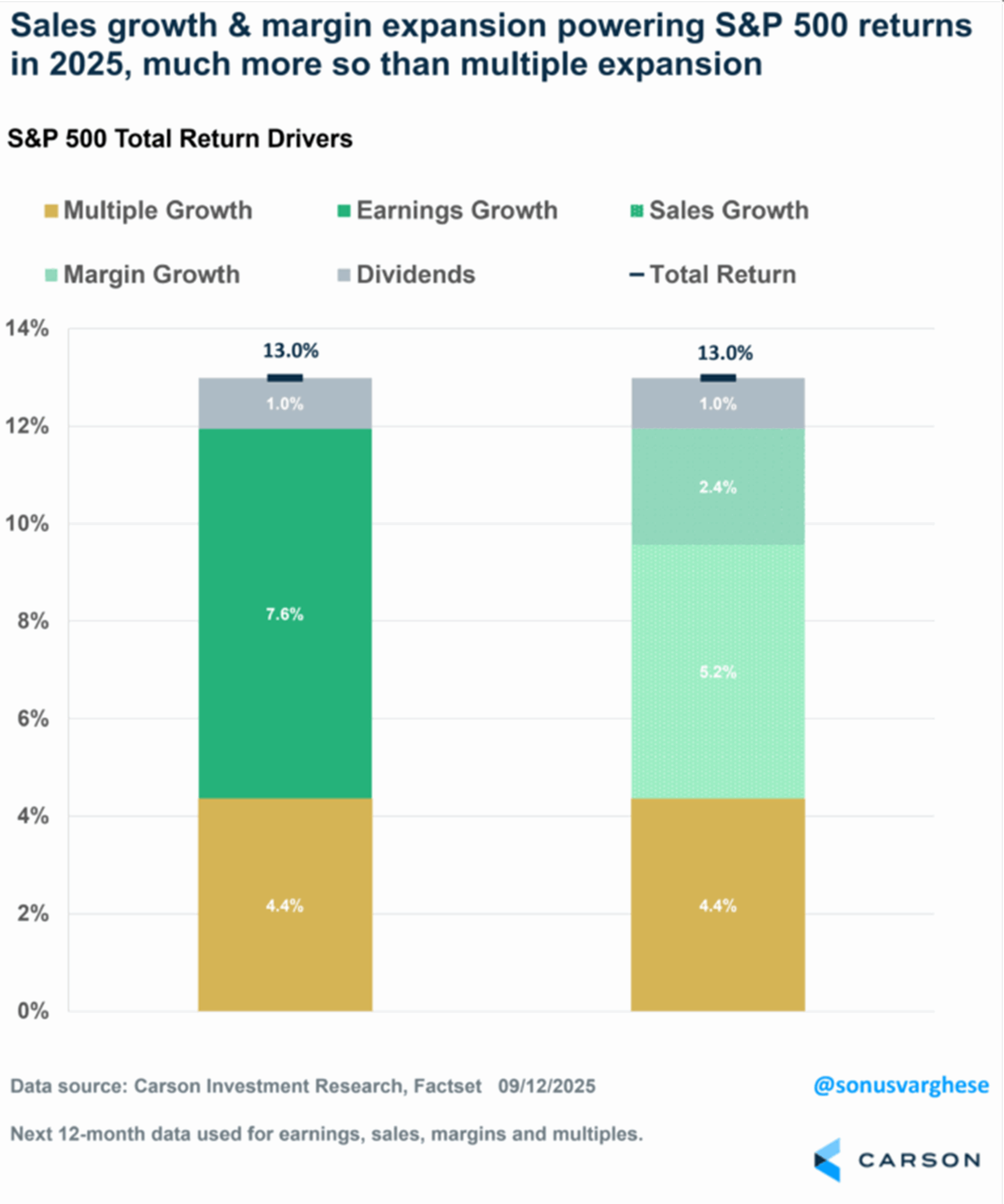 The S&P 500 price index has a year-to-date return of 12.0% (through September 12, 2025), and a total return (including dividends) of 13.0%. As many investors have witnessed, this has come on the back of a 25% total return in 2024, and 26.3% return in 2023. Significantly, over half the S&P 500’s return this year has come from profit growth.
