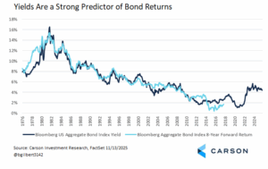 I sometimes get asked about the most important things I consider when thinking about the longer-run outlook for markets. For me, the answer is easy. 1) In the long run, stocks track earnings because earnings drive returns. 2) In the long run, yields drive bond returns. That’s just two short sentences, but it’s the starting point and both are often forgotten in the emotional day-to-day or even year-to-year ups and downs of markets.