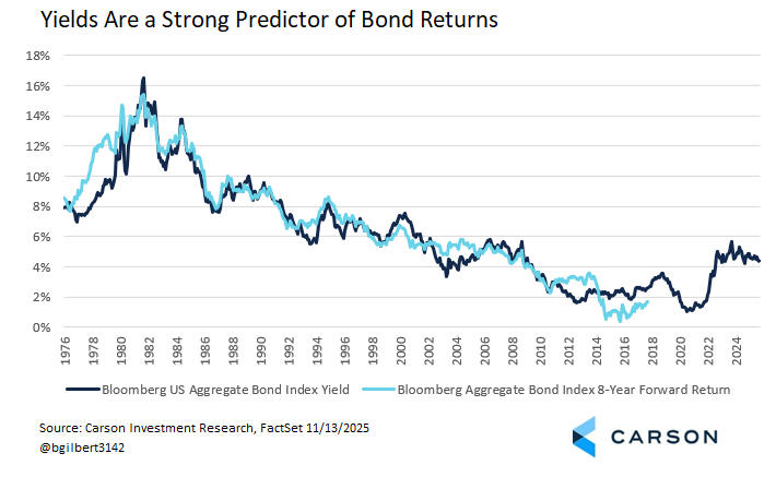 The bond side is easier—take your bearings from yields. That’s partially supported by knowing the exact value of a bond at maturity (assuming it doesn’t default). Right now, the yield on the Bloomberg Aggregate (“Agg”) is 4.3% so a good first estimate of the Agg’s return over the next 10 years is about 4.3%. (That also tells you something about why “momentum chasing” rising bond prices in 2020/2021 didn’t make sense—yields were very low and while we didn’t know the path, we knew return prospects were dim.) Again, this is just an estimate but it’s not as likely to drift as far as you get with stocks. Historically, the annualized return on the Agg eight years forward has been within 1% of the starting yield about 73% of the time. There will be more uncertainty over 10 years but it should still be effective.