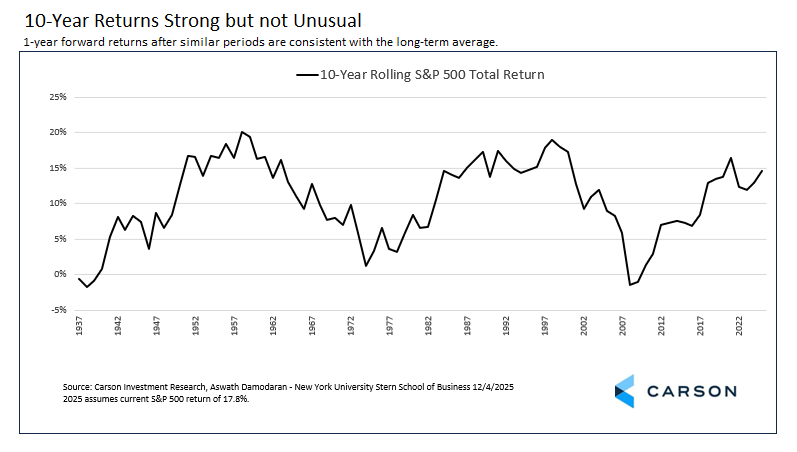 Returns the year after a 3-year streak are about average, 8.3% for a >15% streak and 13.4% for a >20% streak, but that’s over a small sample (with some crossover). The key point is there’s nothing to indicate returns are poorer than usual after three years of solid gains. It just depends on the return environment, which we think will be favorable in 2026 (see Carson Chief Market Strategist Ryan Detrick’s recent Thinking About 2026).