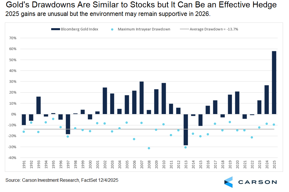 Gold is almost as volatile as stocks are, but its history of a low correlation to stocks and low correlation to bonds—especially during inflationary periods—means its contribution to risk in a typical portfolio is much lower than as a standalone asset. Especially as a bond diversifier, we continue to see the potential value of a modest allocation to gold, for risk mitigation in the current environment as much as for its return potential. But don’t expect that “potential” to be anything like what we’ve seen in 2025.