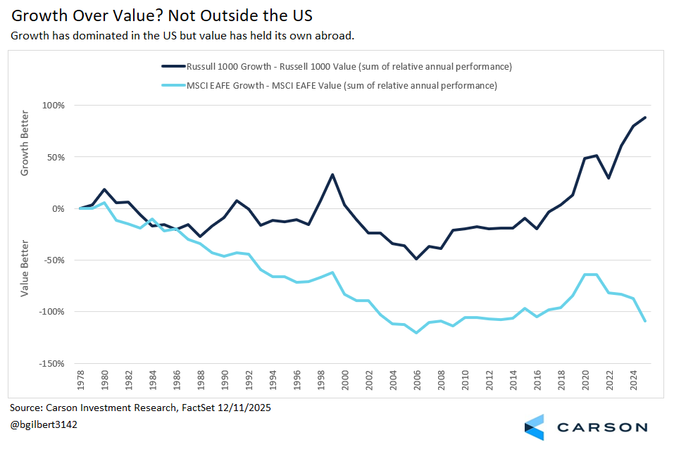 Below is an additive chart of the relative performance of the Russell 1000 Growth and Value Indexes (comparing just the two US style indexes) and the EAFE Growth and Value Indexes (comparing the two EAFE Indexes). The takeaway is that the entire idea of “growth” and “value” has been distorted in the US (not necessarily in a bad way) by tech giant dominance, which has pulled smaller cap style indexes in its wake. But style has been much more balanced outside the US. Don’t give up on value whole cloth—context matters. There hasn’t been a real style edge in developed markets outside the US, and in some ways that may be a purer representation of those quirky but ubiquitous style boxes.
