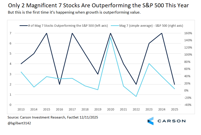 This year, a simple average of the Mag 7 is still beating the S&P 500, outpacing the index by 4.5%-points. But if the year ended today, that would only be the 11th best year of the 13 years they were all around for a full calendar year. And yes, they did underperform one year, in 2022, the best year for value stocks relative to growth since 2008 as investors fled to lower risk stocks.