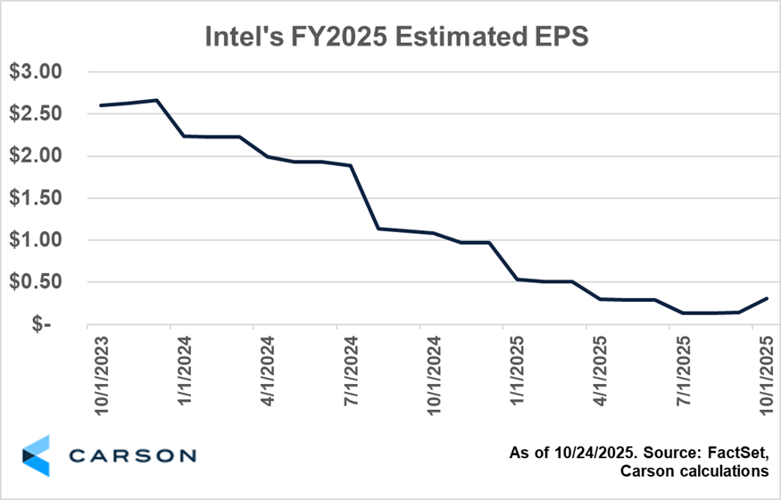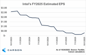 Intel shares continued their ascent. The company’s stock price was up roughly 84% since their last earnings report and were trading roughly 2% higher as of midday Friday. This large move comes on the heels of investments from Nvidia and the Trump Administration to help the beleaguered semiconductor firm. While these cash inflows help repair a damaged balance sheet, investors received fundamentally positive news on Thursday: Intel’s core business may be inflecting higher. Revenue of $13.7 billion beat FactSet’s consensus estimate of $13.2 billion, and the company’s non-GAAP gross margin of 40.0% was the highest result in six quarters (all FactSet data). As shown below, FactSet’s consensus estimated EPS for Intel’s fiscal 2025 moved up following the report, signaling a stark change from the company’s previous string of disappointments and missteps.