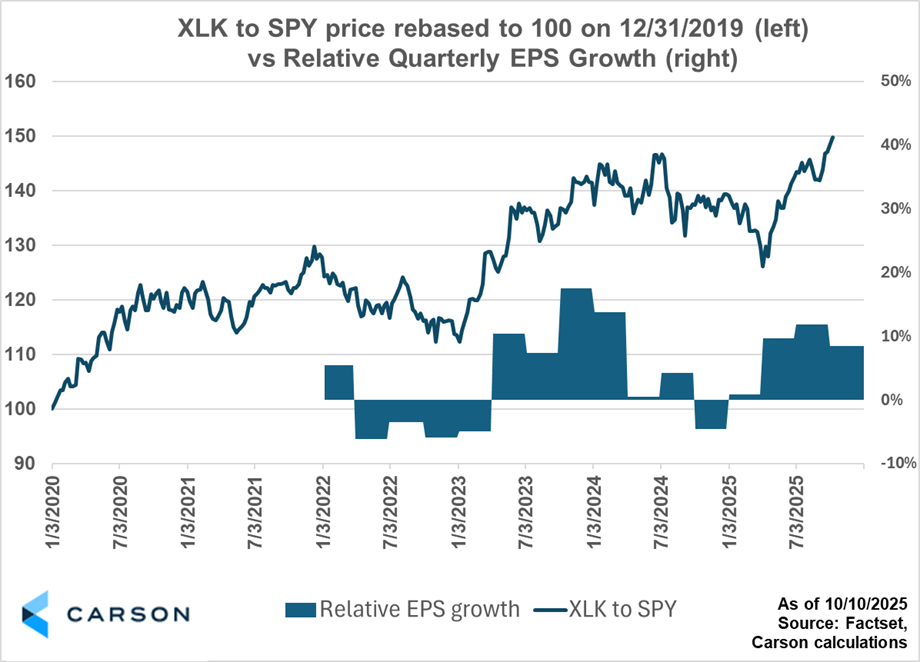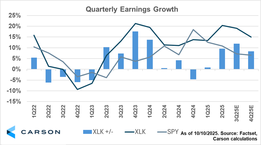 The technology sector, as proxied by XLK (the iShares Technology Select Sector Fund), is expected to deliver higher earnings per share growth than the broader market this reporting period. The sector is expected to grow earnings 19.1% compared to the year ago period, whereas the broader S&P 500 is expected to grow earnings 7.2%. This 11.8% EPS growth outperformance for tech, if achieved, would represent an acceleration from last quarter’s 9.6% outperformance. That would mark the largest outperformance for the sector relative to the broader market since the first quarter of 2024. As shown in the chart below, tech has not seen this type of sustained EPS growth outperformance since 2023.