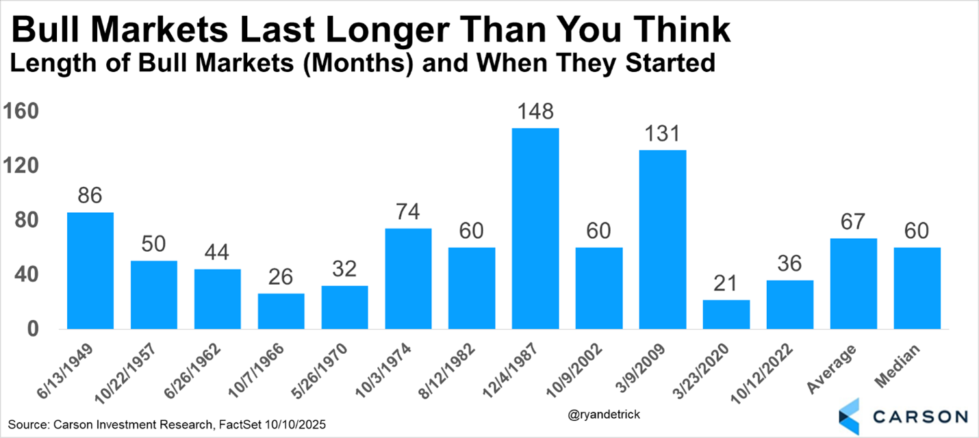 For those of us getting older, we like to say that age is just a number. Bull markets like to say that as well. In fact, looking at the 11 bull markets since World War II, the average one lasts more than five years.