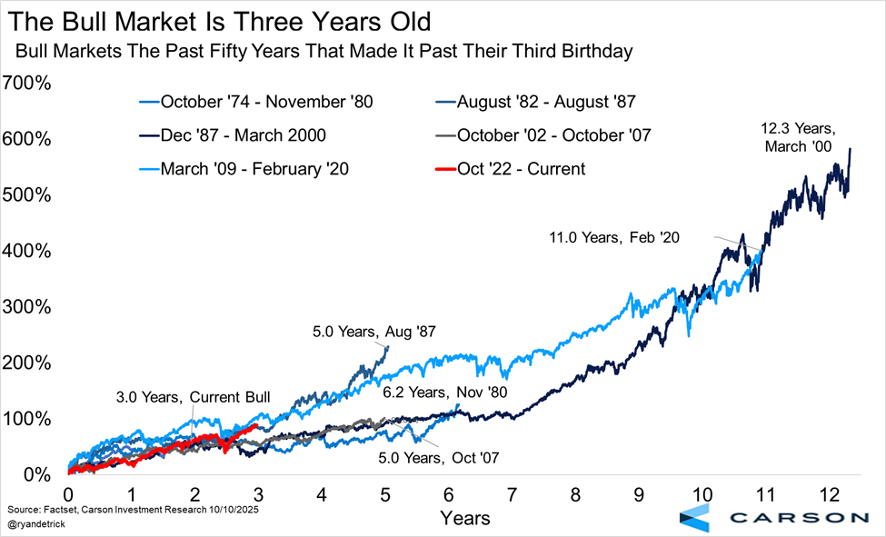 Can you believe it? The bull market turns three this Sunday. It might feel like a lifetime ago, but three years ago right now stocks were down 25% and in the depths of a vicious 10 month bear market. Investors may forget this now, but most of the high-flying technology and AI leaders right now were actually cut in half or more back in 2022. Many might recall the bear market of 2022 as a minor blip after the rally we’ve seen, but for those of us that were there, it wasn’t a fun time for investors. Interest rates soared, the Federal Reserve was hiking rates unlike anything seen in a generation, and inflation was rampant. Then a funny thing happened—stocks bottomed and have been climbing ever since.