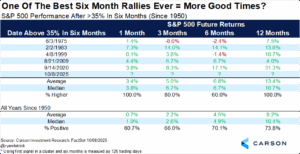 Lastly, stocks just had one of their best six-month rallies ever, up more than 35% in only six months. Yes, near-term we wouldn’t be shocked at all if we saw a well-deserved pause after this huge rally and the current five-month win streak, but bigger picture, this type of strength isn’t what you see at the end of bull markets.
