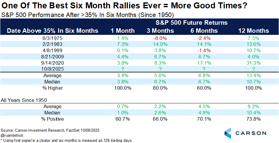 We found only five other times going back to 1950 the S&P 500 was up more than 35% in six months (using the first signal in a cluster). Strong than average performance is perfectly normal over the coming 12 months, but a year later stocks have never been lower and higher more than 13% on average, which should comfort many nervous bulls who think this may be a blow off top.