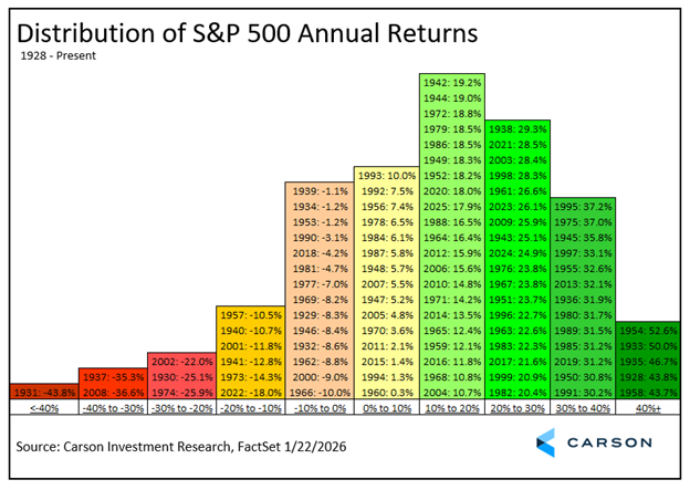 Today I want to look at it from another angle. It’s a lower bar, but it makes a similar point that may be more meaningful for some investors. Since many investors are prone to worry, instead of saying we’re going to have a good year (our Outlook forecast is a 12-15% total return for the S&P 500 in 2026), let’s say some investors may be reassured if they saw solid evidence that we were quite unlikely to see a bad year.