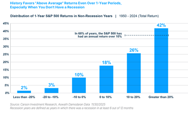 In our 2026 Outlook: Riding the Wave, we took a look at the average return for the S&P 500 (and the likelihood of a positive year) for all years versus only years when the economy is growing (avoids a recession), consistent with our base case for 2026. Not surprisingly, when you take recessions off the table, historical returns have looked better, and the S&P 500 is higher more often. But while that result is not surprising, it’s often neglected.