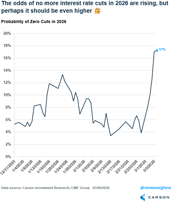 Now you have an energy shock as well. Even if you treat that as “transitory,” the case for cutting rates this year isn’t clear-cut. Right now, the market (using fed funds futures) is pricing in 100% probability of one more 0.25%-point cut in 2026, and a 71% probability of a second one. The probability of a second cut was 100% last Friday before the war started (February 28th), and markets were even pricing in 44% probability of a third cut.