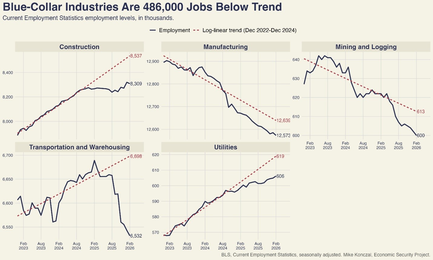 Interestingly, the job market slowdown is not really about AI-related layoffs. The healthcare sector was the main engine of job growth last year, but the industry lost 19,000 jobs last month after averaging 73,000 jobs per month over the prior three months (November-January). This is partly because of a strike of 31,000 physicians. But job creation has been weak even in blue-collar industries: construction, manufacturing, transportation, mining and logging, and utilities lost 35,000 jobs in February. Job creation in these sectors has been running well below trend over the past year (about 500,000 jobs below where you’d expect based on the 2023-2024 trend).