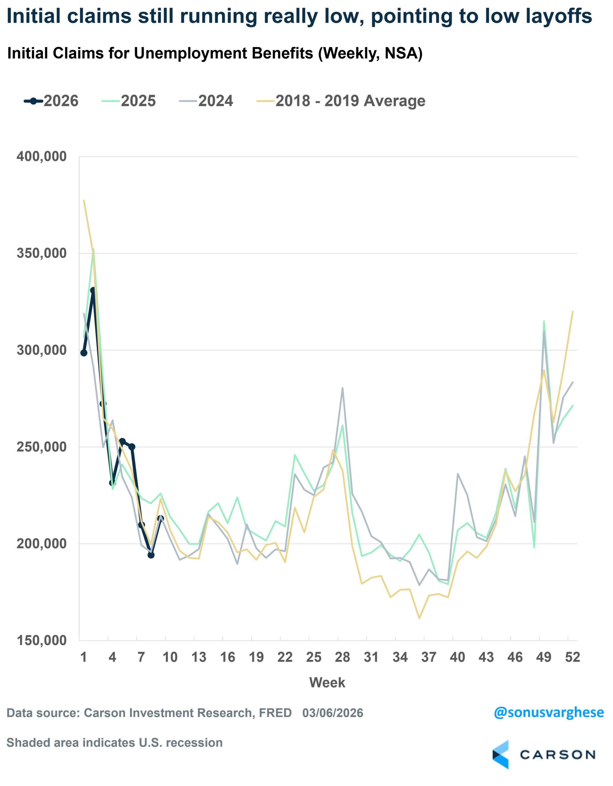 Another positive is that initial claims for unemployment benefits, which offer a real-time view of the labor market, remain really low. As of last week, initial claims were running below where claims were a year ago, or even in the same week in 2018-2019.