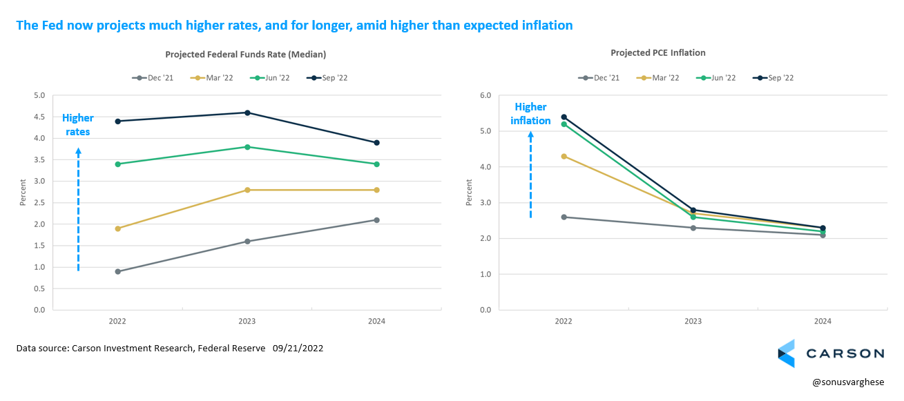 By the end of 2022, they project policy rates to get up to 4.4%, a full percentage point above what they projected just three months ago in June. And as of the end of 2023, they now expect the target rate to hit 4.6%, about 0.8% above their previous projection. These projections have risen rapidly this year amid 40-year highs in inflation. And crucially, they now project staying at these high rates through 2024 at least.