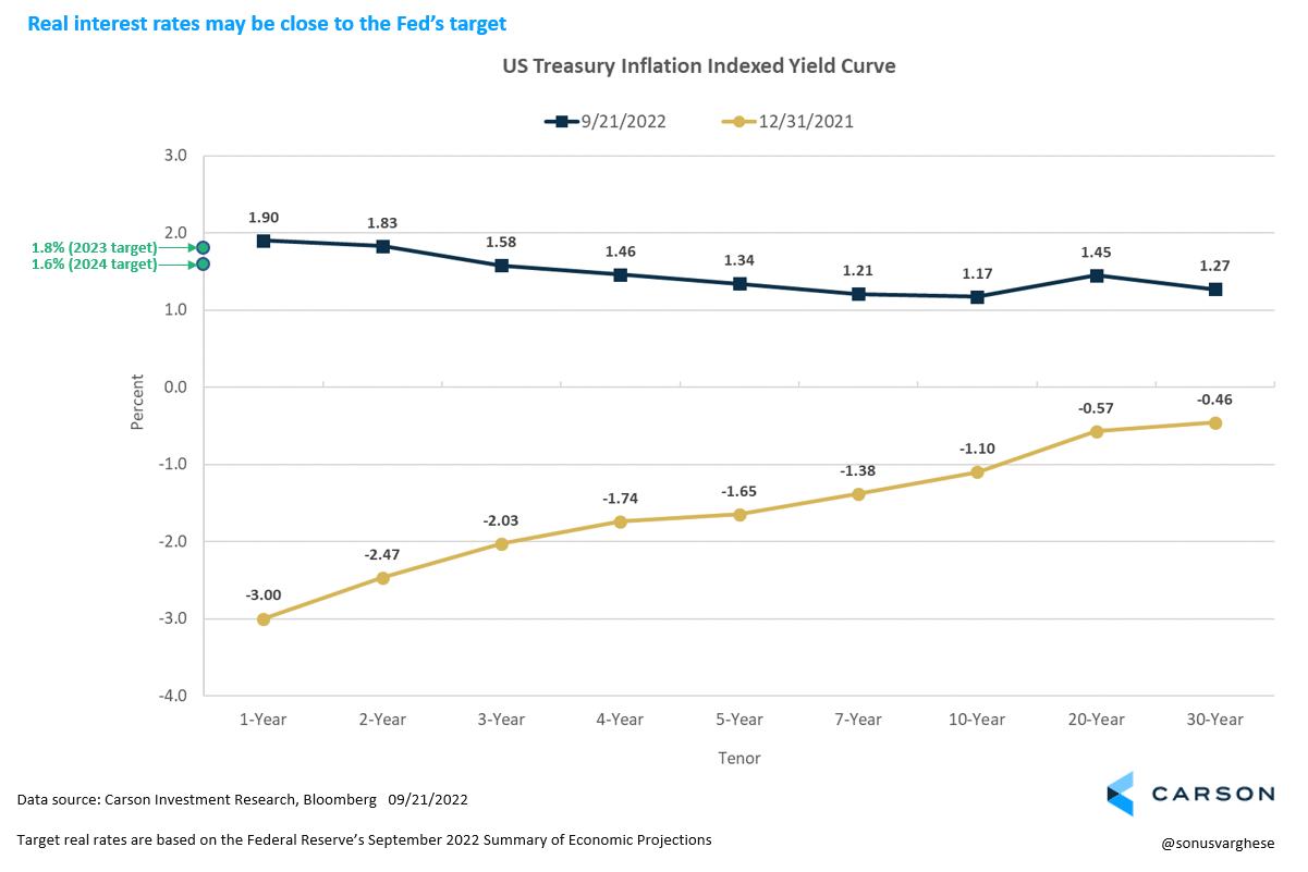With respect to valuations, over the past 5+ years, we’ve seen that when real interest rates move higher, valuations fall, and vice versa. This year is a good example of falling valuations amid rising real rates. The Fed wants high real rates – their latest projections suggest real rate targets to be between 1.5-2.0% in 2023 and 2024. As the chart below illustrates, the “good news” is that short-term real rates are already in this range. They’ve moved up significantly since the end of last year when real rates were negative across the curve.