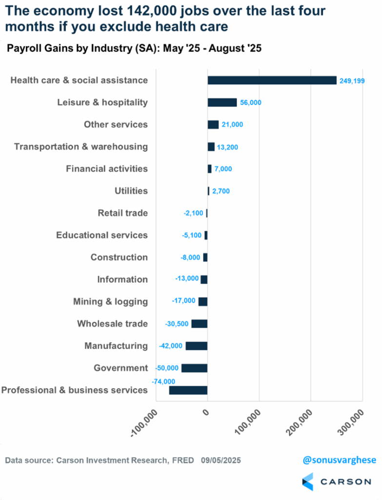 From May through August, the economy created 107,000 jobs (the post-Liberation Day phase). But get this: the health care sector created 249,000 jobs. Without that, the economy would have lost 142,000 jobs over the last four months. The weakness is across the board in cyclical areas: