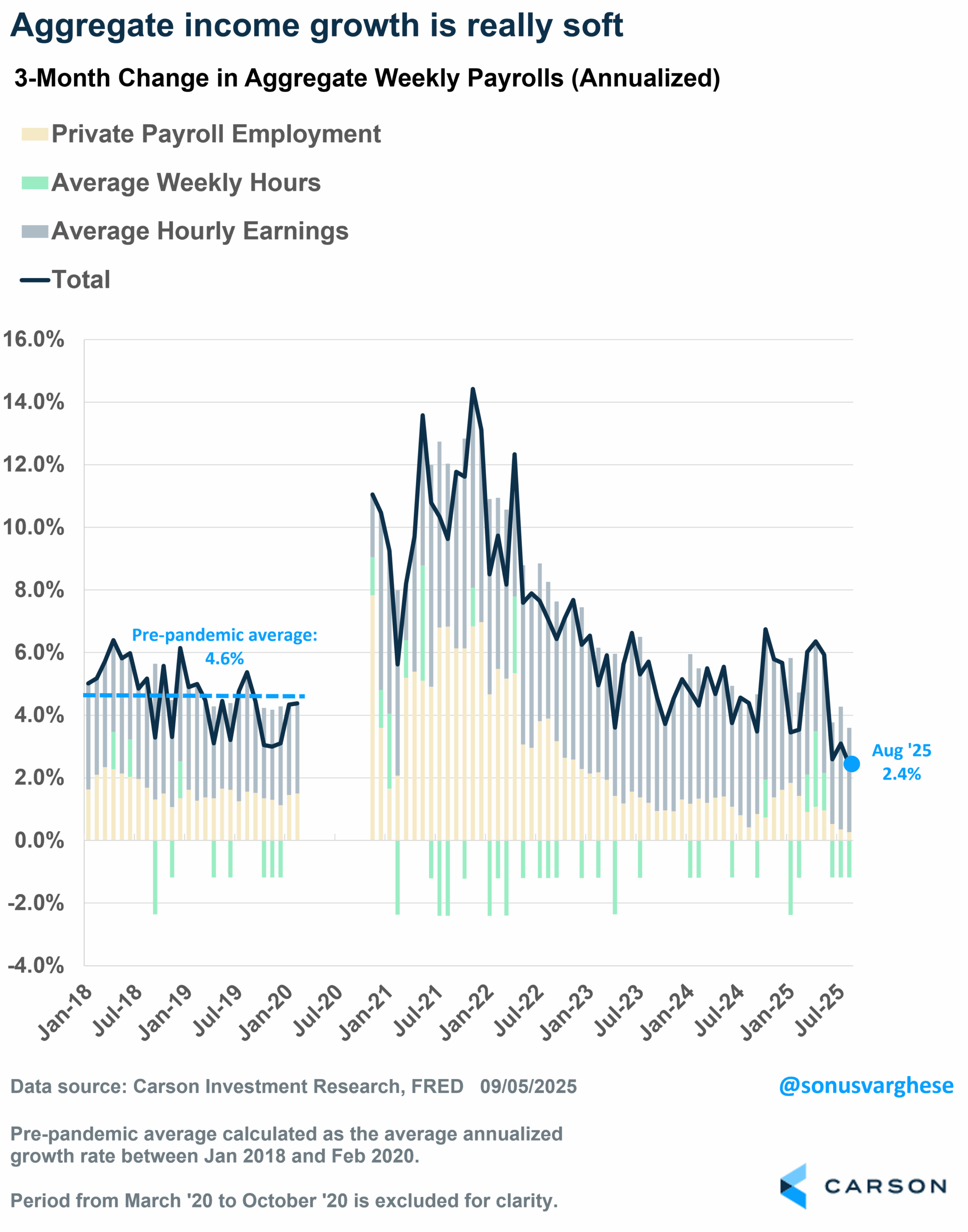 There’s a temptation to treat upcoming rate cuts as “good news” – after all, lower rates should give a boost to cyclical areas, notably housing. But I’m always wary of taking bad news as good news. If the labor market is weak, aggregate income growth (across all workers in the economy) will be weak. Less income means less spending. And that will hurt profits. So bad news in the real economy, if it continues, will be bad news for the market as well.
