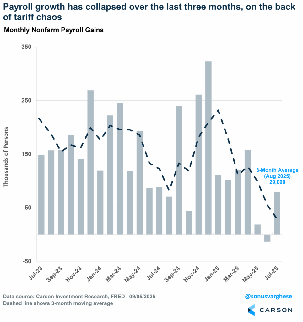 Anytime you get a month with negative payroll growth, that should be a big flashing red signal. Historically, that only happens near recessions. But even if you take the 3-month average, that’s only 29,000. For perspective, the 3-month average was 111,000 in March and 209,000 back in December 2024. We’ve seen a really sharp slowdown over the last few months, and it shouldn’t be a huge surprise given the tariff chaos in April and May.