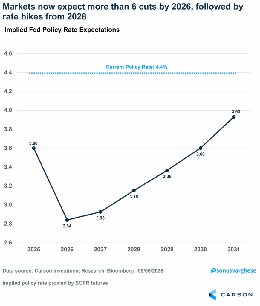 What’s interesting is that investors are not only pricing a rate cut in September – markets are pricing in 3 cuts in 2025 (for a total of 0.75%-points), and several more in 2026, taking the Fed policy rate from 4.4% to 2.8% by the end of 2026. This is way beyond what would be priced in if you just expected an “insurance” cut from the Fed (to protect the labor market). It looks like markets expect President Trump to get his people on to the Fed by next year, and they push through rate cuts like he wants. And as I noted above, this is in the face of inflation remaining above the Fed’s target and moving in the wrong direction.