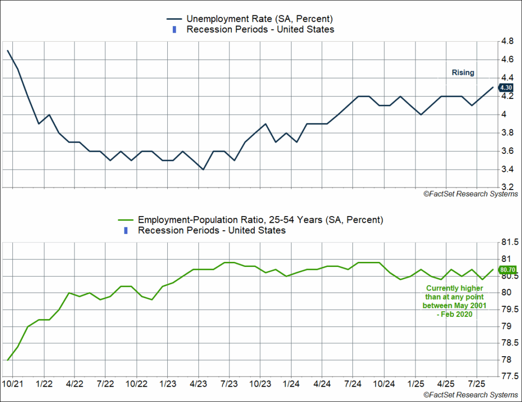 Now, the economy likely doesn’t need to create as many jobs as it did last year to keep up with population growth, since immigration has stalled. But there’s no question that hiring is really weak, which is pushing the unemployment rate higher. The unemployment rate hit 4.32% in August – that’s historically low but it’s moving in the wrong direction and just hit the highest level since October 2021. The only plus in the payroll report is that the prime age employment-population ratio (which sort of controls for an aging population and labor force definitions) picked up to 80.7%. That’s higher than at any point in the 2000s and 2010s expansion cycles. The fact that this is stable tells you that labor market weakness may be concentrated amongst young and older people – and usually the younger set starts to see trouble before everyone else.