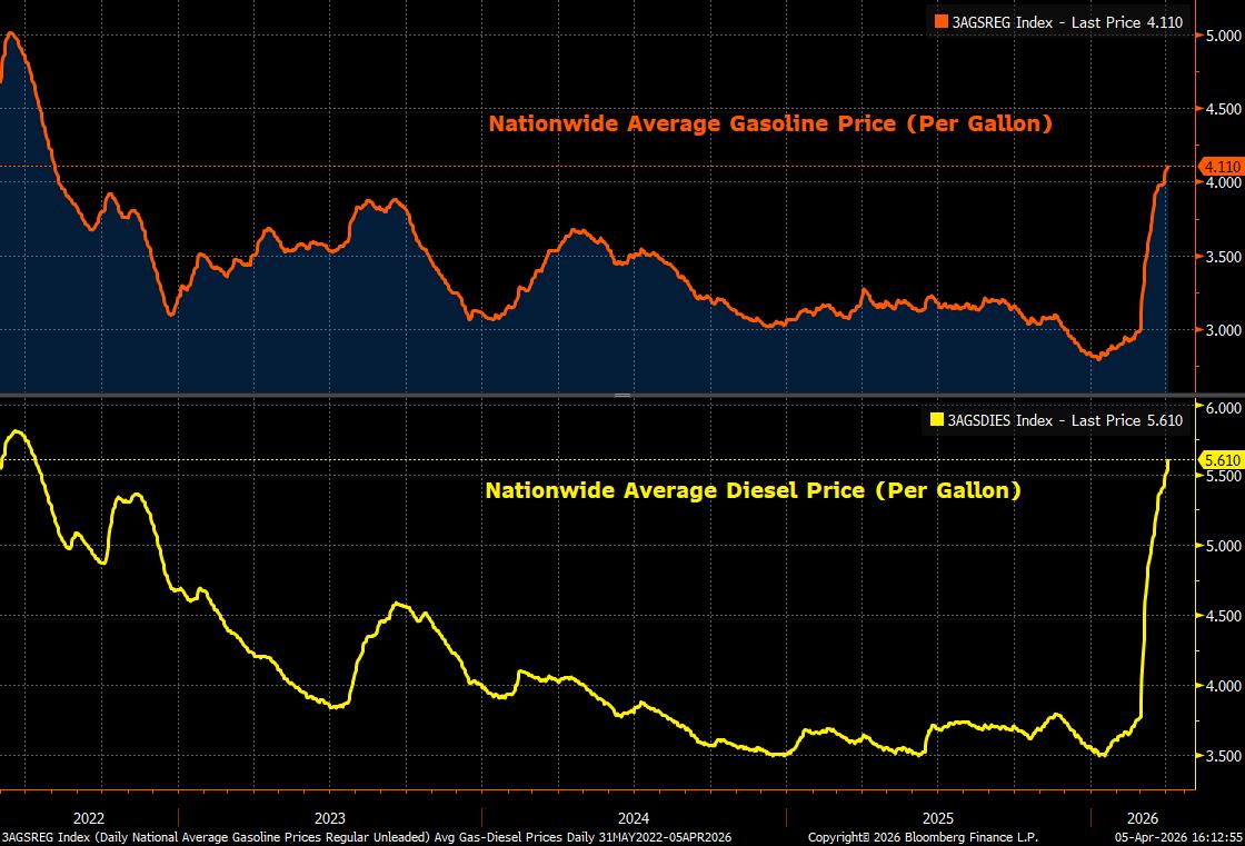 - Nationwide diesel prices have surged even more, to $5.61/gallon, the highest since July 2022, and up from $3.75/gallon pre-crisis.