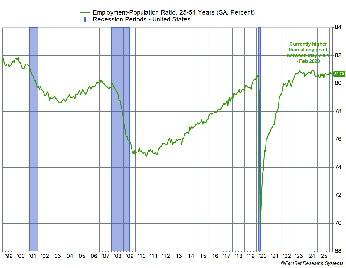 The picture looks better if we look at the prime-age employment-population ratio, which avoids issues around definitions of who is unemployed and demographics (due to an aging population). The ratio is at 80.7%, close to the peak we’ve seen this cycle (80.9% in September 2024) and higher than at any point between May 2001 and February 2020. In other words, more people in their prime-age working years are working now than at any point in the 2000s or 2010s expansion cycles (as a percent of the population).