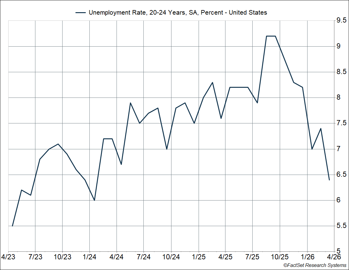 One question that’s recently come up is the impact of AI and whether that’s pushed the unemployment rate higher for less experienced workers. It doesn’t seem like there’s been a huge impact as yet, with the unemployment rate for 16–24-year-olds falling from a peak of 10.6% in November to 8.5%. That’s the lowest in almost two years. Interestingly, that’s been driven by a falling unemployment rate for 20-24-year-olds, from 9.2% in September to 6.4% in March, the lowest since January 2024. If anything, you’d think recent college graduates in the 20-24 range would be most negatively impacted by AI. This data is noisy, but as you can see below, the recent downtrend is quite clear.