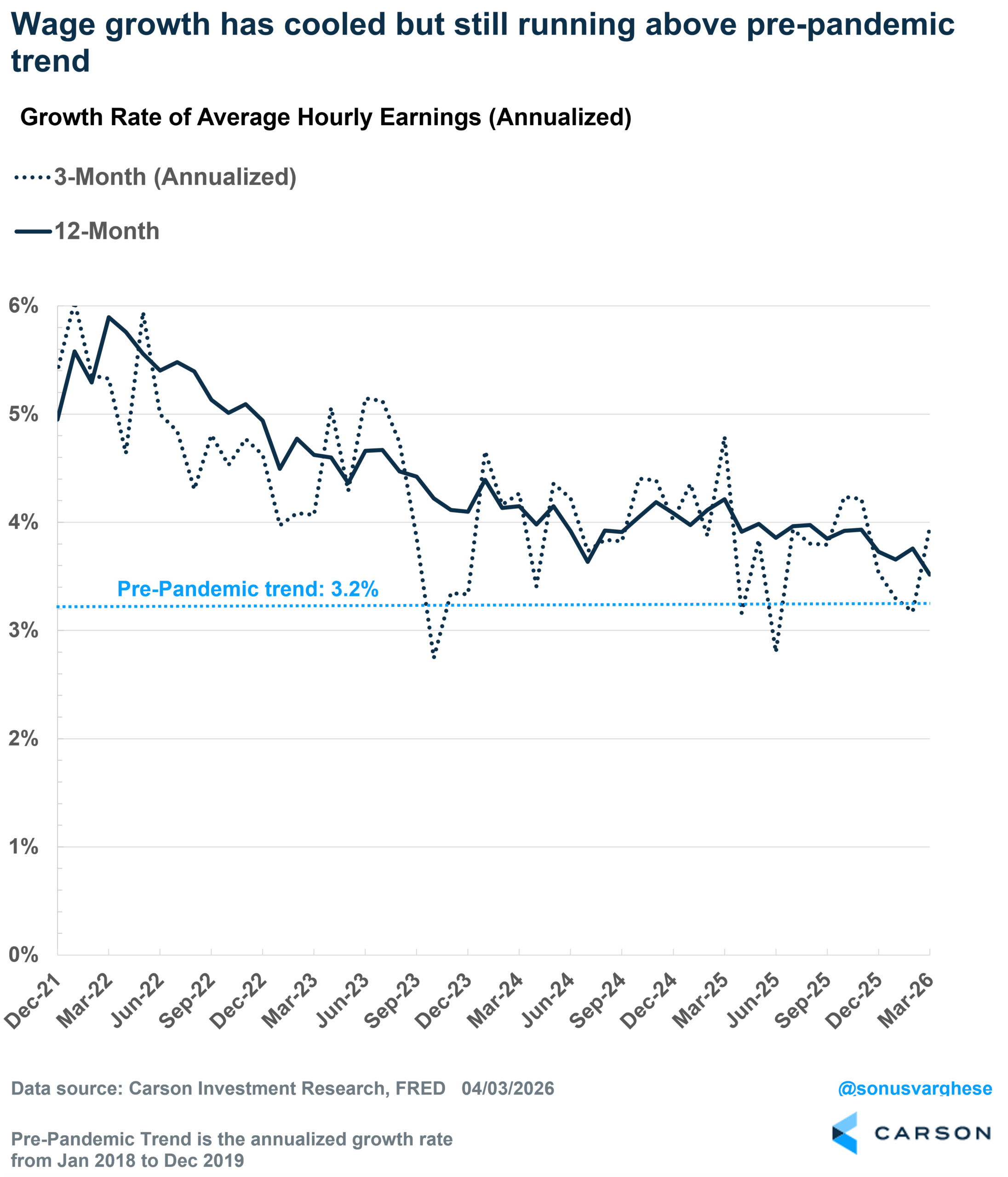 Another datapoint you’d look at if you want to see whether the labor market is tight or not, and a potential source of inflationary pressure, is wage growth. Wage growth has steadily cooled over the past year and is currently running at a 3.5% year-over-year pace, but that’s still above the pre-pandemic pace of 3.2%. Moreover, wage growth is running at a 3.9% annualized pace over the past three months.