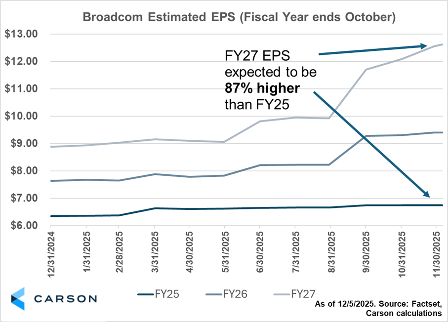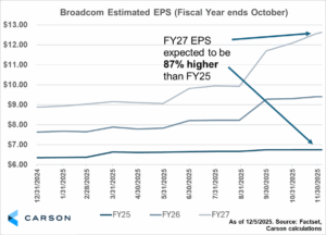 Broadcom is expected to earn $9.41 in its fiscal year ending October 2026, which is 23% higher than the $7.63 estimate analysts had coming into 2025. Further, in their fiscal 2027, Broadcom is now expected to earn $12.62, up more than 42% from the $8.88 estimated earlier this year (all FactSet data, as of 12/5/25). All told, analysts expect EPS to nearly double in the next two years and this is perhaps a main reason why the stock’s near-term earnings multiple has expanded.
