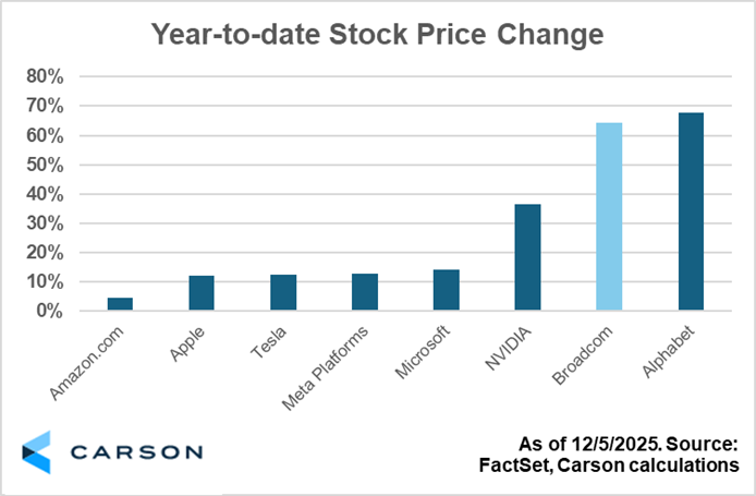 Broadcom’s market capitalization eclipsed $1.8 trillion this past week, surpassing Tesla’s roughly $1.5 trillion market cap, to firmly plant the company as one of the most valuable in the market (FactSet data, as of 12/5/2025). Broadcom is on pace to register the second largest stock price gain of the Elite 8 this year, up 64% for the year which trails behind only Alphabet’s 68% rise this year (FactSet data, as of 12/5/2025).