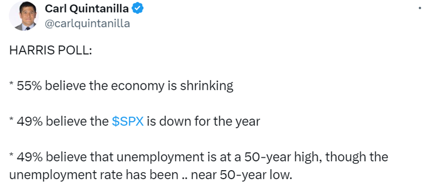 For starters, a recent Harris Poll showed that more than half of those polled thought the economy was shrinking and nearly half thought the S&P 500 was down on the year along with unemployment at 50-year highs. Thanks to Carl Quintanilla from CNBC for sharing this.