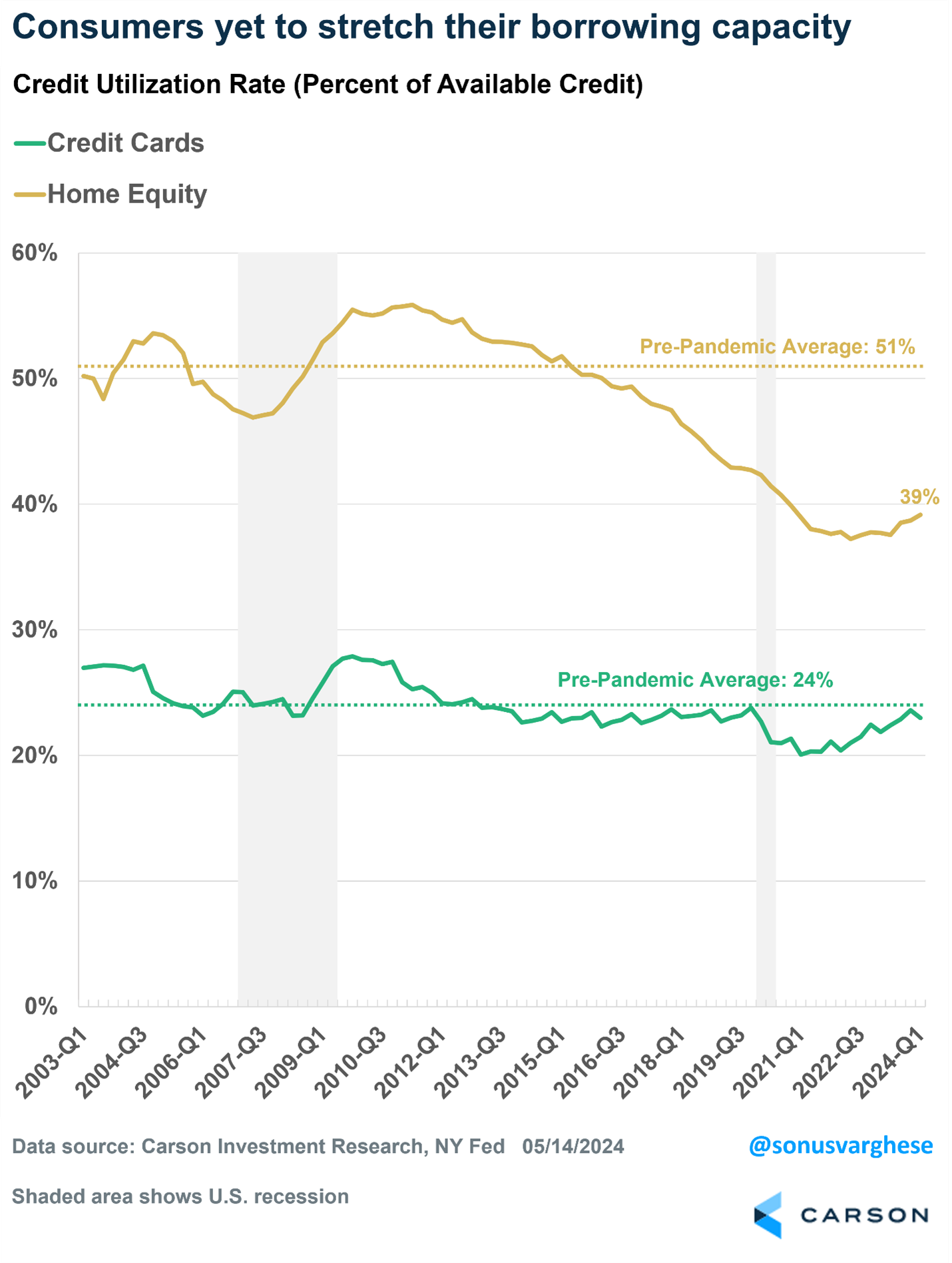 Credit cards maxing out is another common myth we hear. Again, just looking at the data shows this isn’t true. Credit utilization is how much of your credit you are using. If you have a $10,000 credit card limit and you have a balance of $2,000 that is a credit utilization of 20%. Would you believe credit utilization actually fell from 24% to 23% last quarter? Yep, it sure did, once again showing consumers aren’t tapped out or maxing out their credit cards. Oh, and this is still beneath pre-pandemic levels. Additionally, home equity credit utilization was steady near 39%, still well below the historical average of 51%, more dry powder for consumers.