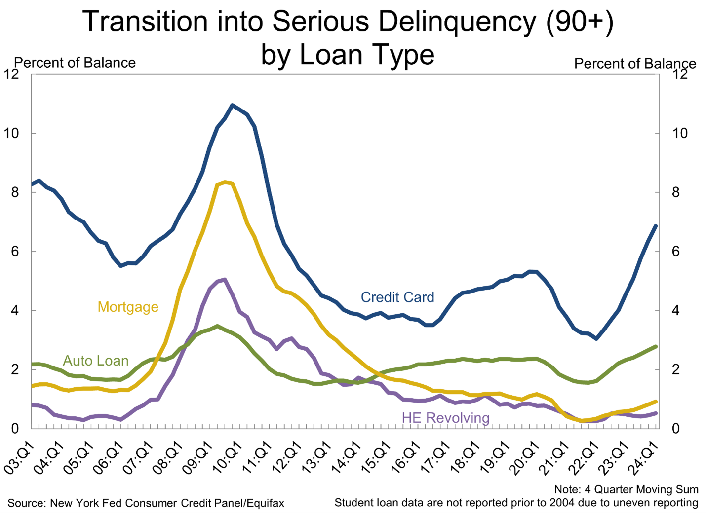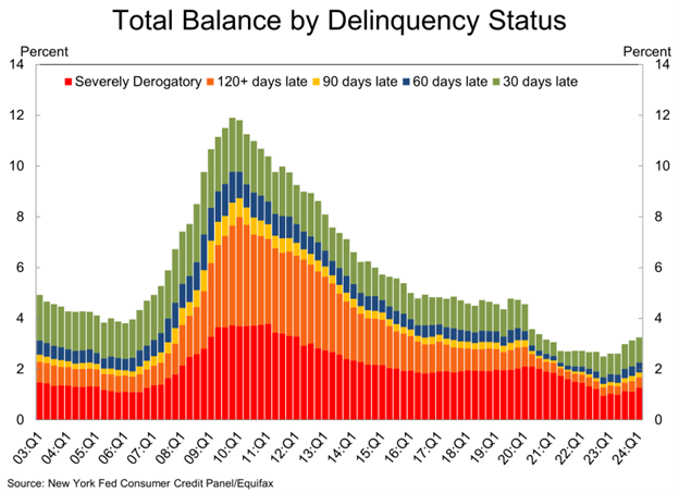 Delinquencies grew last quarter and this could be showing some cracks, but it isn’t all bad. 96.8% of all balances are still on time, which is better than late 2019. The most derogatory balances are moving higher, but they are still only 1.7% of total balances, which is lower than 2.8% levels pre-pandemic and 3.0% in 2007.