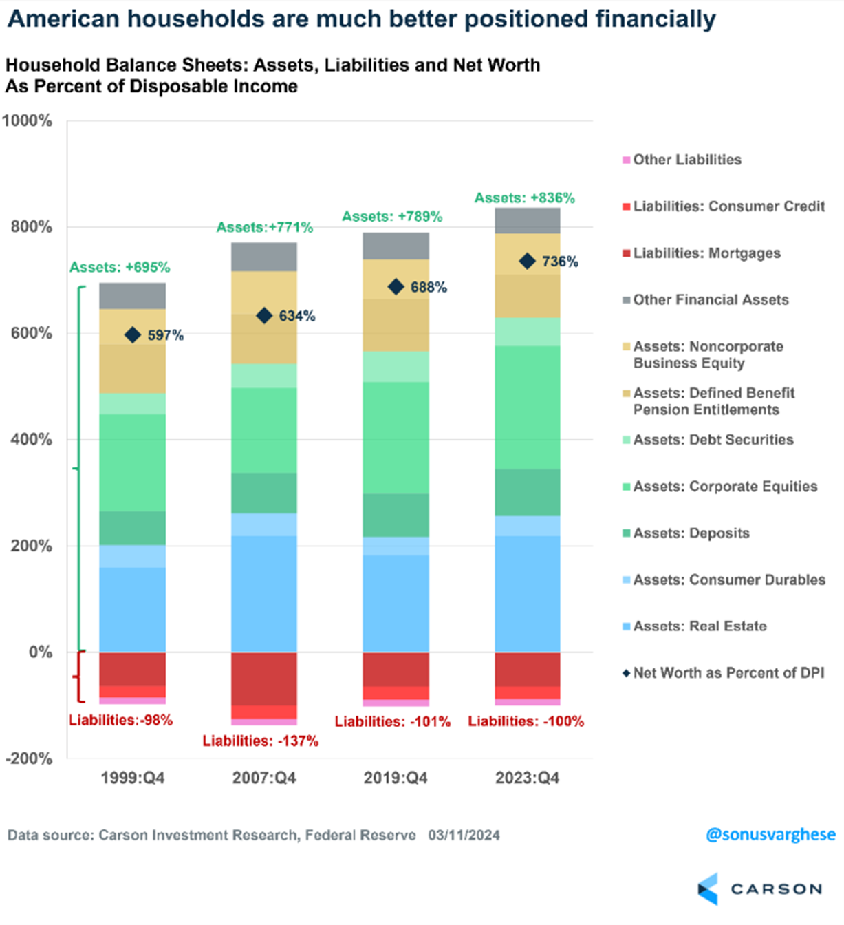 One of my favorite charts that Sonu produces is this one, which looks at household liabilities and assets, but normalizes things by disposable income. Yes, debt overall is much higher than 50 years ago, but so is net wealth and incomes, so we need to do something to get more of an apples to apples comparison. Doing this Sonu found assets to disposable income was more than 800%, the highest level since the late 1990s. Adding to the myth busting, liabilities relative to disposable income was right around 100%, the same level as 25 years ago! So debt hasn’t moved relative to income, yet assets have soared. That right there tells us household balance sheets are in very good shape.