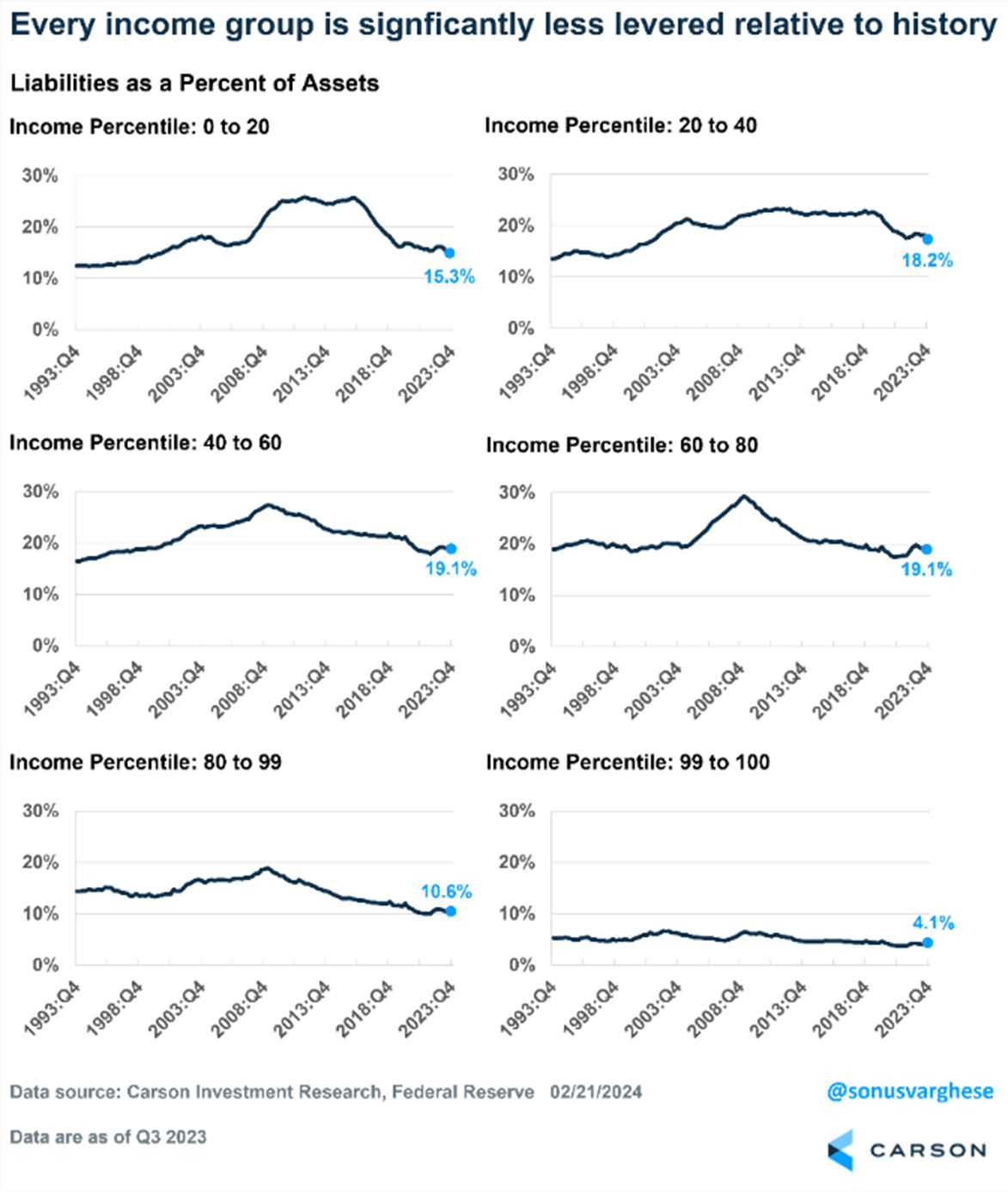 Lower income groups are struggling amid higher interest rates is another thing we hear quite often. We aren’t going to say that a lot of people aren’t struggling, because they are, but overall this appears to be another myth. Using Fed data, breaking things down by income percentiles showed that across all income levels liabilities as a percent of assets have improved the last several years, with lower incomes actually improving the most, something you don’t always hear on TV during the evening news, huh?