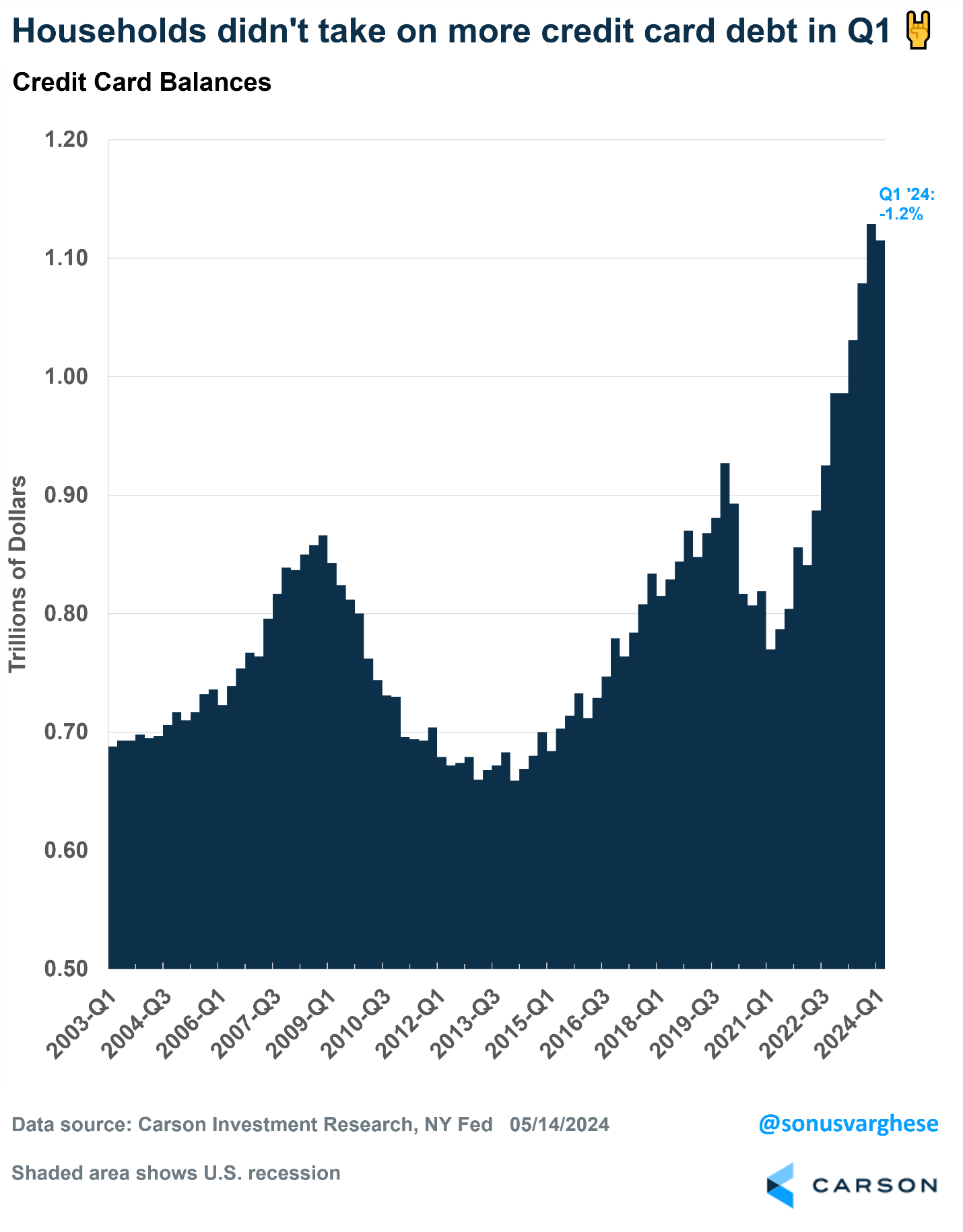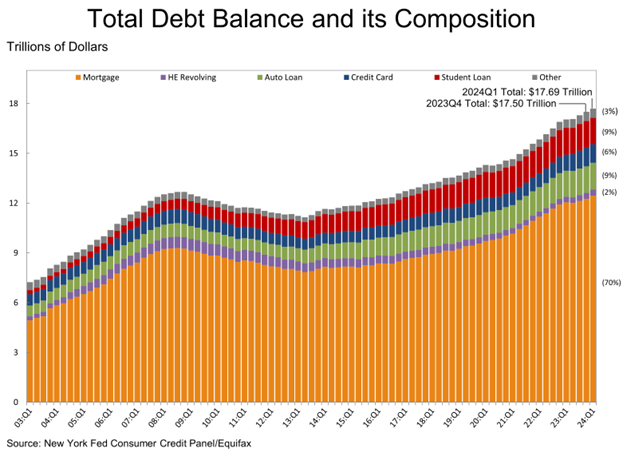What about overall debt? Yes, it is at an all-time high, up 1.1% last quarter and up to $17.7 trillion overall. But take note, about $12.5 trillion of this is mortgage debt, with much of that set at historically low interest rates. Another potential positive is credit card debt was down last quarter!