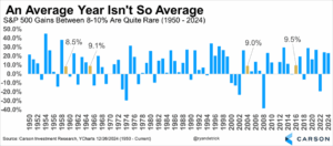 The average year for the S&P 500 gains about 9%, so you’d think a return between 8% and 10% would happen all the time, but in fact, it is pretty darn rare. This is why the joke about the statistician at the top is so important. There is no such thing as average when it comes to investing.