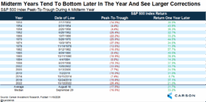 Here’s each midterm year broken down. What stands out to me is they don’t tend to bottom until later in the year (August 18 on average and a median September 29). Still, look at those returns a year later. Should we see some typical midyear volatility, it could be very important to stay the course and not panic.