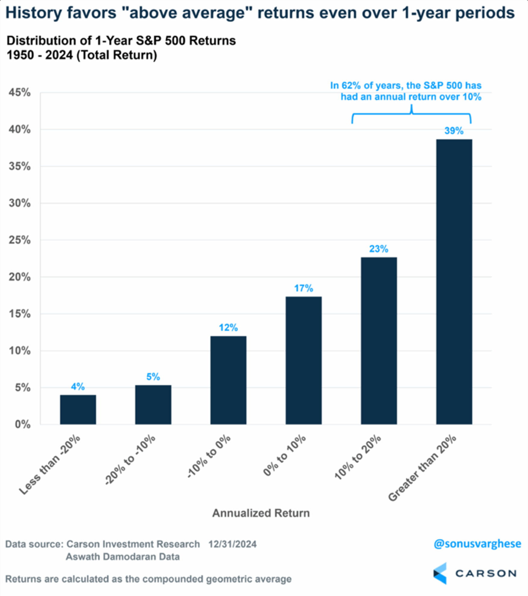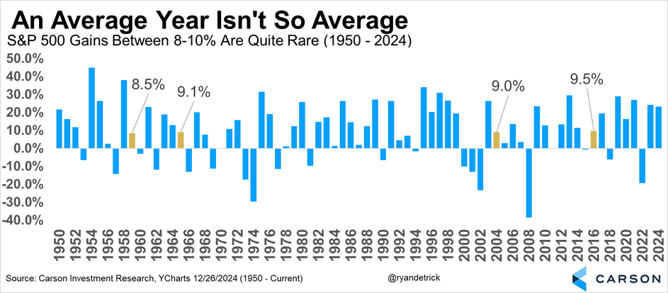 I’ve shared this chart a lot over the years, but it is just as important now as it was decades ago. We found only four times the past 75 years that the S&P 500 gained between 8% and 10% (or about average). This tells us as investors that returns outside that range are more normal than not.
