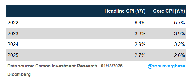 The December CPI release was an important one because it closes the book on 2025. Here’s how headline and core CPI inflation (ex food and energy) have ended each of the last 4 years: