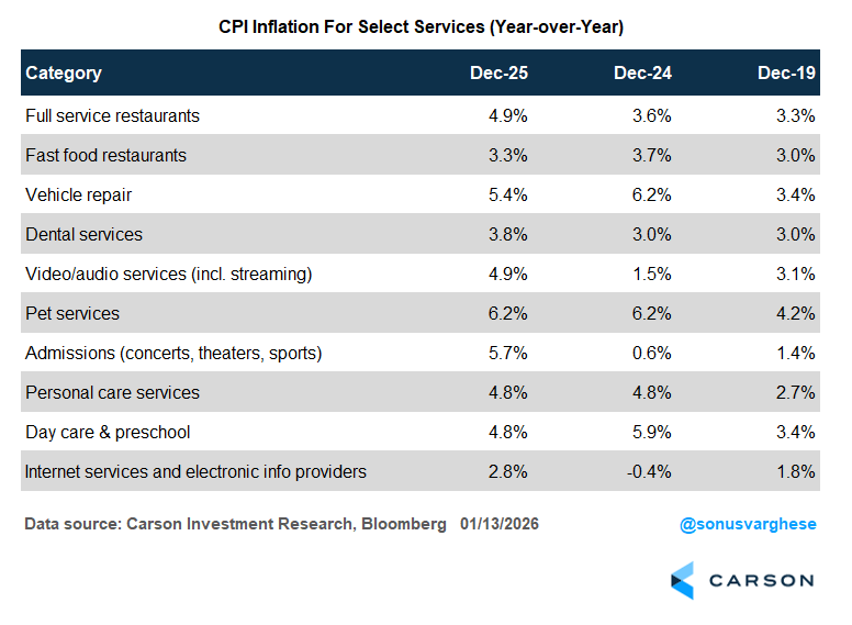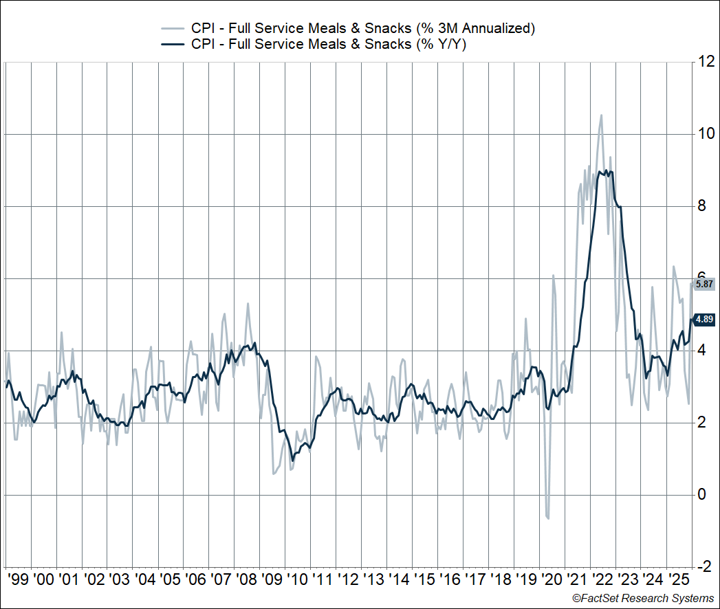 Inflation for seated dining restaurants rose 4.9% in 2025, up from 3.6% in 2024. That’s a faster pace than anything we saw between the late 1990s and 2020. In fact, over the last quarter, prices rose at an annualized pace of 5.9%. That’s hot, and by itself, inconsistent with “normal” 2% inflation.