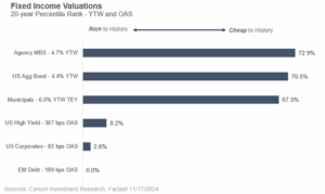 Fixed income can be looked at in a similar manner. For investors that hold a long-term spot in a portfolio for bonds, being cognizant of certain valuation measures within the components of portfolios is important. In the chart below, a higher value is better, indicating that the relative level of yield relative to what that asset class has offered historically is attractive. What is nice about this analysis is that with bonds, math rules the day. Bonds mature at par (barring default), and so returns can be predicted in a more accurate manner. High quality fixed income still looks good, agency mortgages and the broad aggregate bond index (of which a large portion is agency mortgages and Treasuries) trade at reasonable yield profiles. Spread sectors like corporates, high yield, and emerging markets, however, continue to trade at very tight spreads. In fact, based on our data, emerging-market debt (USD-denominated) has never traded at a tighter spread than right now. While these sectors may continue to offer decent absolute yields, the potential for additional spread tightening (and thus capital appreciation) remains quite low. Risks skew to the downside (i.e. spread widening), leading us to prefer taking risk in equities or alternatives while keeping fixed income high quality.