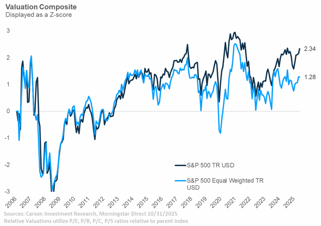 A natural question to ask when looking at these relative comparisons is whether to remove – or at least minimizing – the amount of technology and technology-related exposures from the analysis. One simple way to do this is to look at the S&P 500 on an equal-weight basis. The equal-weight index has less than half the exposure to technology and communication services than the cap-weighted index, and no single stock is more than a few tenths of a percent (depending on last rebalance). Looking at these two indices in comparison using the same valuation composite but in absolute terms, we can see a widening spread between the capitalization-weighted and equal-weighted index. What’s important here is not necessarily the widening spread between the indices, but more that once you strip out the effects of the mega caps, there is a better and reasonable value proposition in the index than many valuations measures might give credit for. This connects back to the first chart, indicating that outside of mega cap growth there is plenty of attractive value for an investor to rotate into.