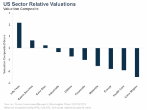 The recent drawdown from all-time highs (-5% intraday at the time of this writing) has done nothing to tarnish a great year for broad equity markets. With any strong run in the market, examining where valuations end up as a result is a worthwhile exercise. Often, price appreciation is warranted on the back of strong earnings growth and fundamentals – something we are no doubt seeing today. As third-quarter earnings season comes to a close, 82% of companies have beaten expectations and the year-over-year growth rate is more than 13% (according to FactSet)! Those are fantastic numbers, yet despite the strong earnings growth we still see valuations for certain segments of the market at elevated levels. Having a broadly diversified portfolio that’s not “all in” on more expensive parts of the markets helps to provide balance going forward.